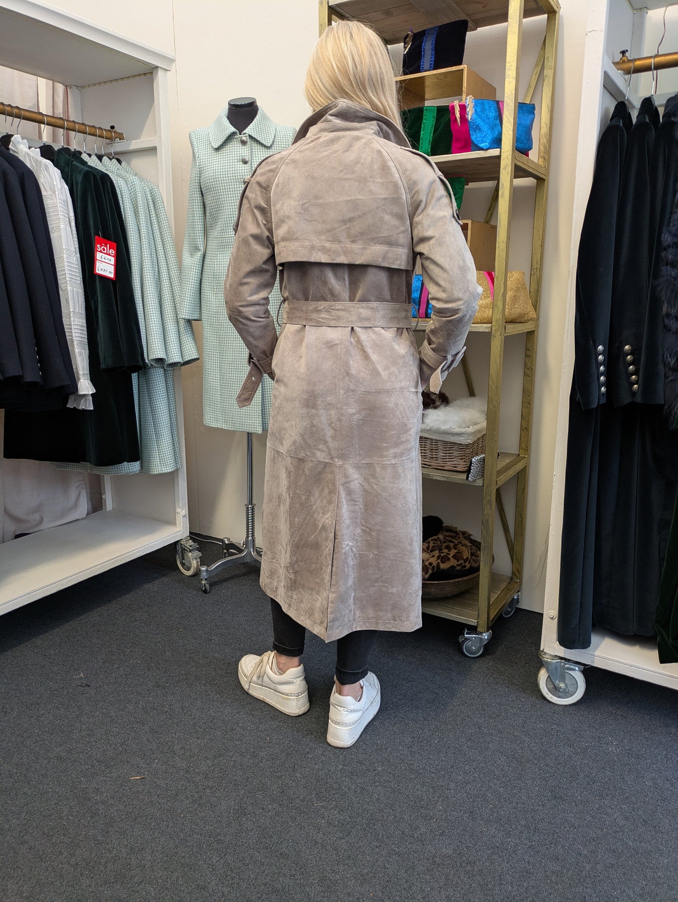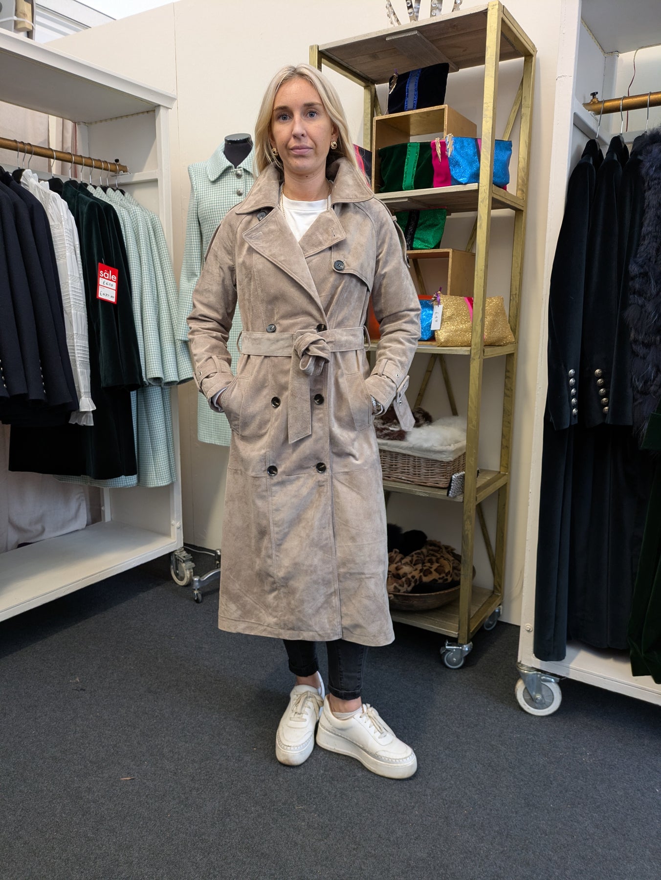 This is definitely one of the star items in the 2025 Sample Sale - in beautifully soft light grey/brown suede this classic coat has all the iconic Trench details you would expect.