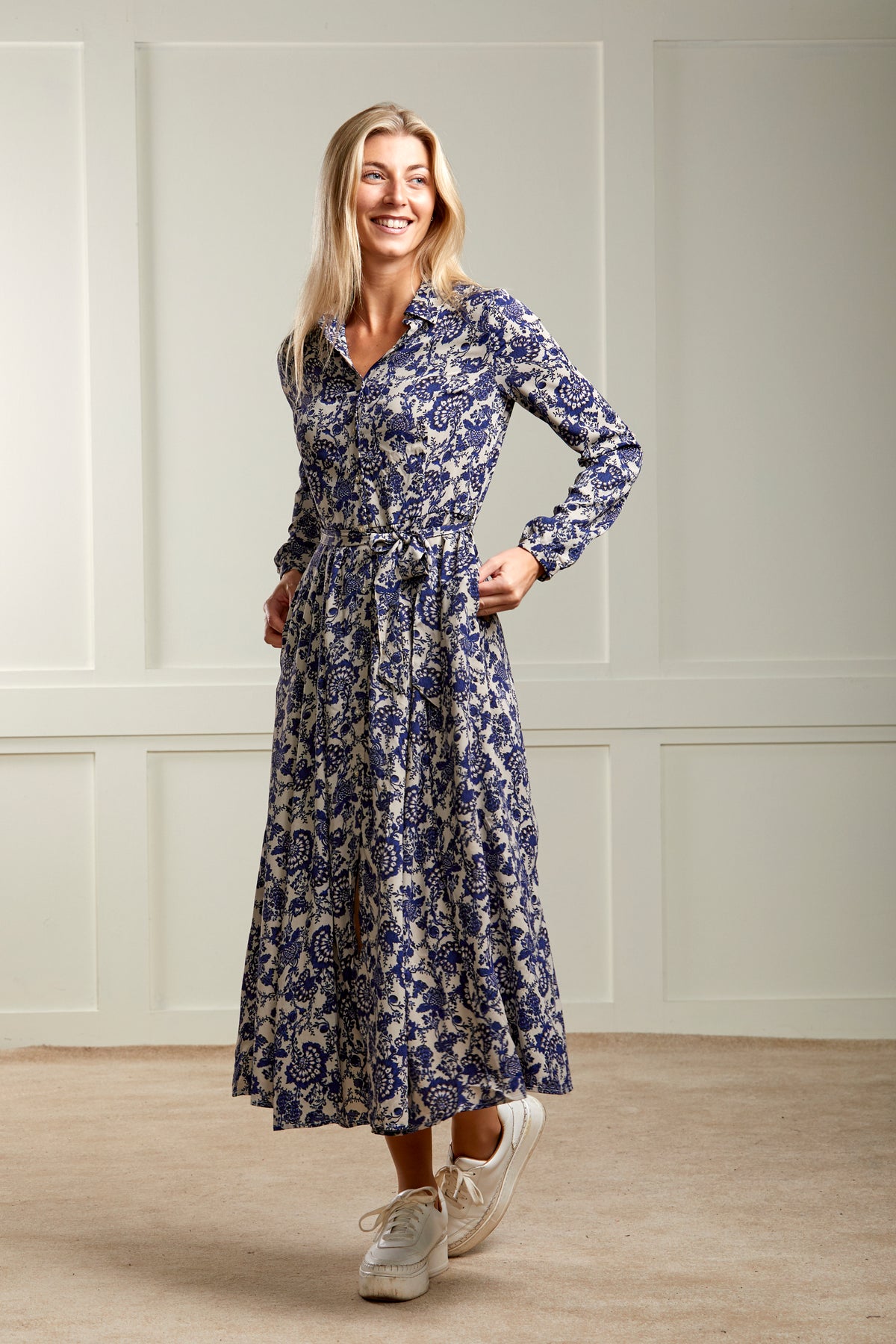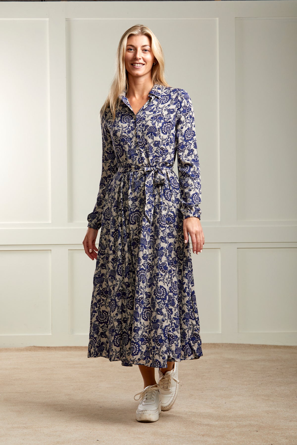 This is the perfect shirt dress for AW25 in a pretty blue and taupe floral print. We know just how flattering this design is because every time we have it in stock it just flies out - so now is your chance ! With a classic, fitted shirt style bodice and collar, this silky dress has a full button front and fitted waist. The tie belt completes the look and can be tied in a variety of ways.