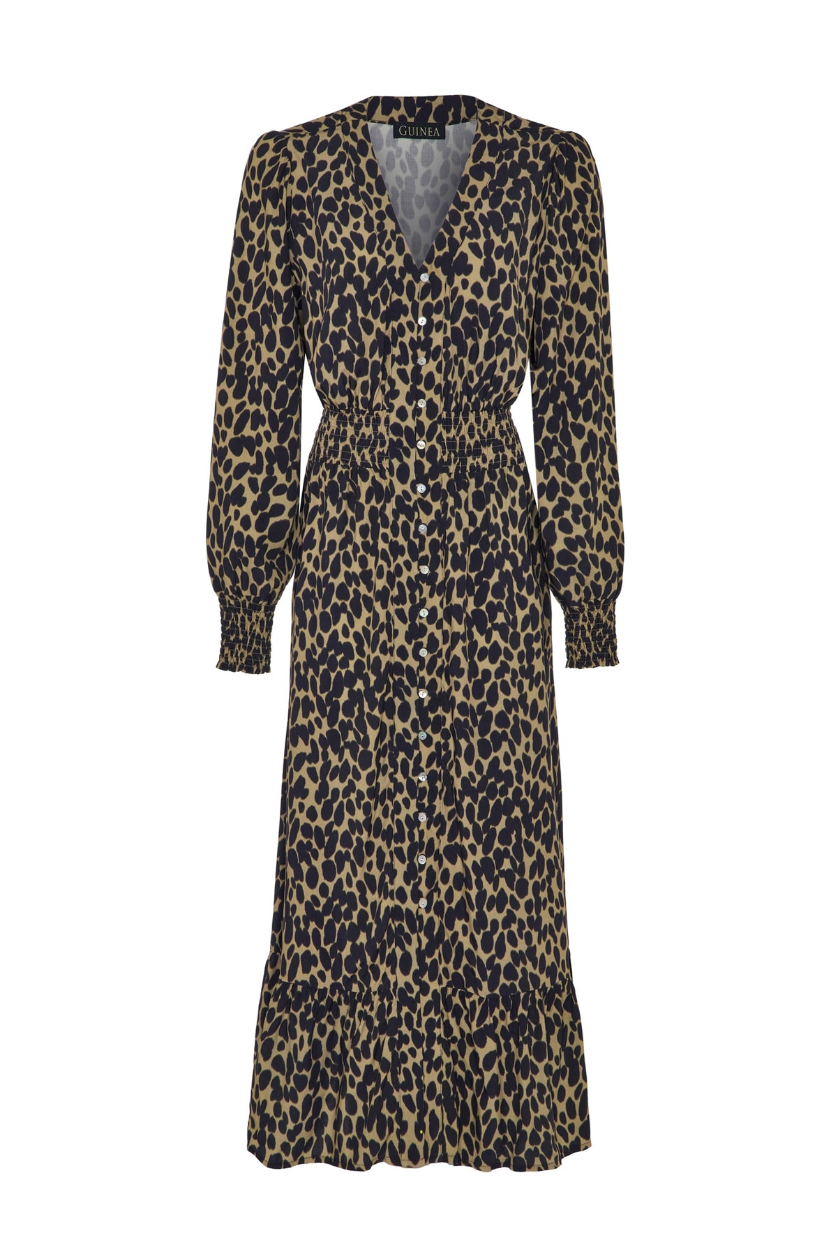 In a silky, soft flowing sustainable fabric, the Lola is printed in a classic Guinea print in soft golds and black. Easy, instant glam!